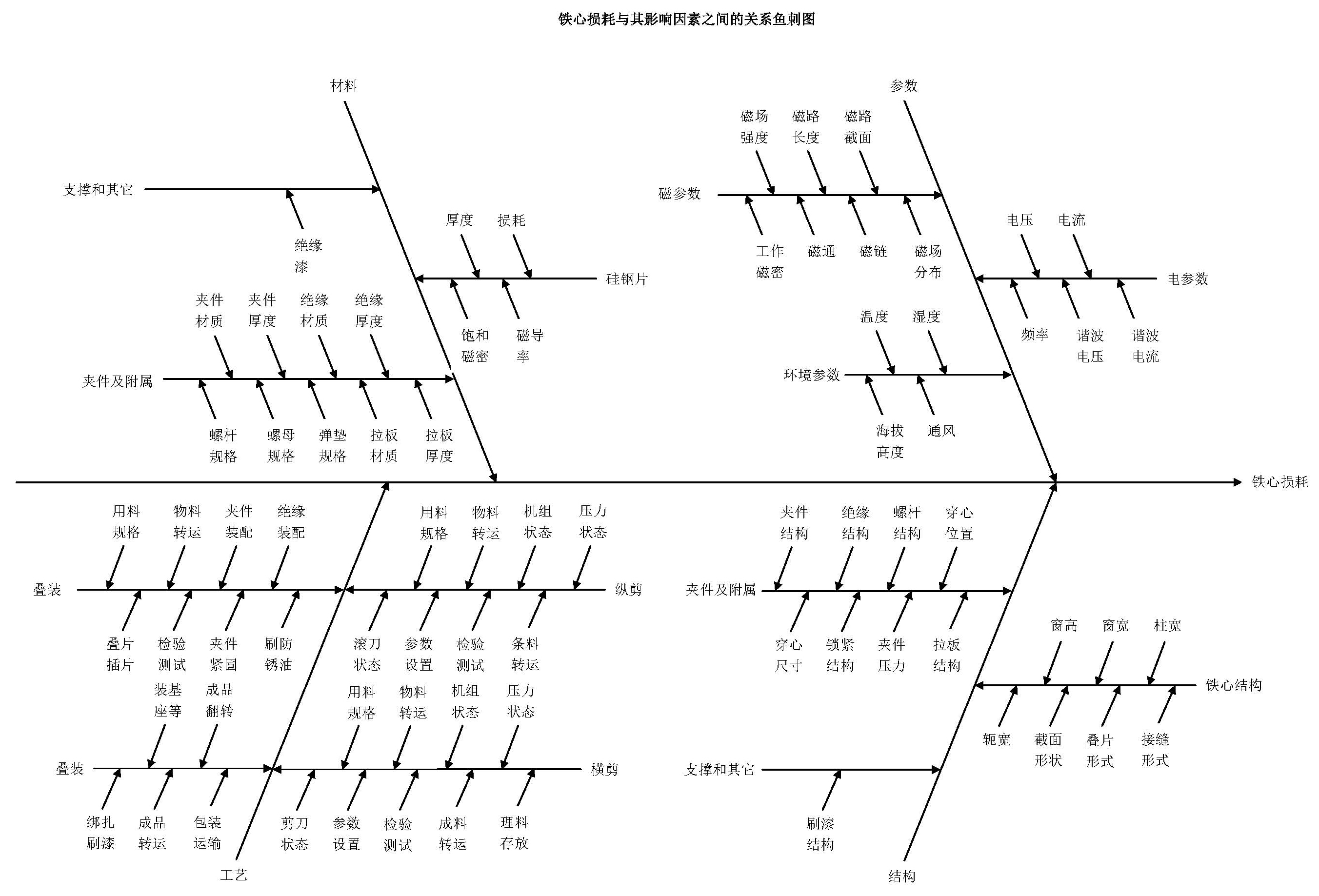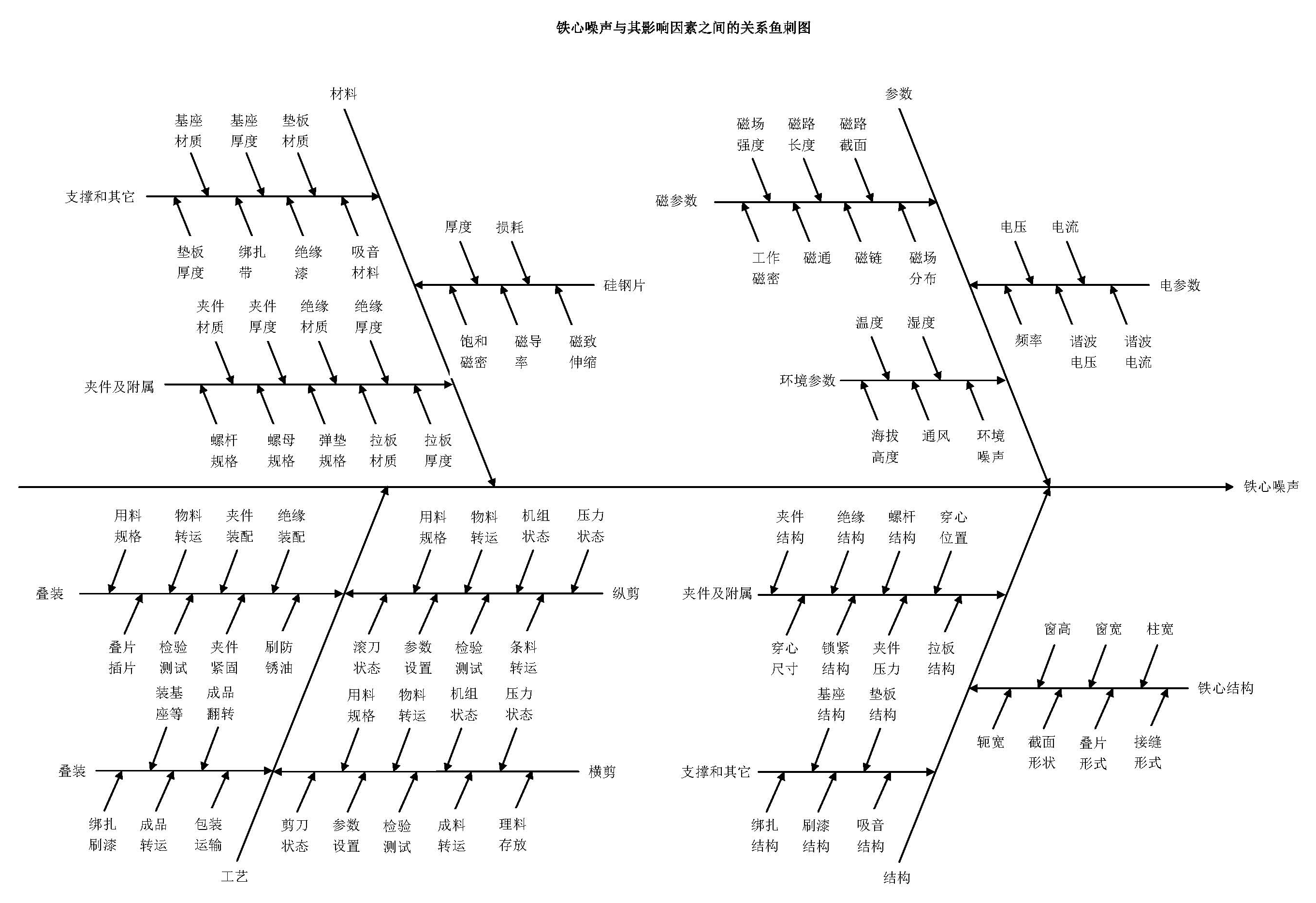 ◇ 普天研發(fā)中心針對影響鐵心性能的各種可能的因素,進(jìn)行全方位的研究,全面優(yōu)化鐵心的各項參數(shù)、材料、結(jié)構(gòu)和工藝等,確保鐵心具有最優(yōu)性能。這里畫出鐵心主要性能:鐵心噪聲和鐵心損耗,與重點研究的主要影響因素之間的關(guān)系魚刺圖如下: