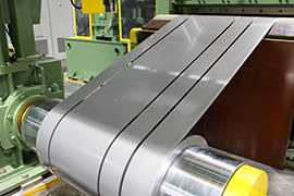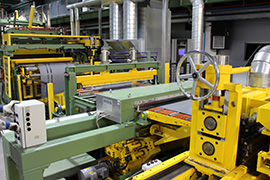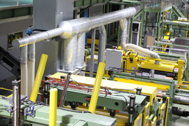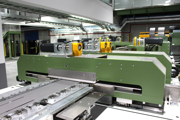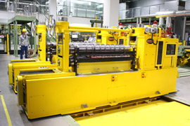 國內(nèi)特有的中心定位式縱剪機組,配有智能張力輥和自動在線測厚測損系統(tǒng),既能保證剪切過程中原材料表面質(zhì)量和性能不受任何損傷,又能準確記錄剪切后的材料損耗。最大剪裁寬度為1250mm,速度為200m/min。