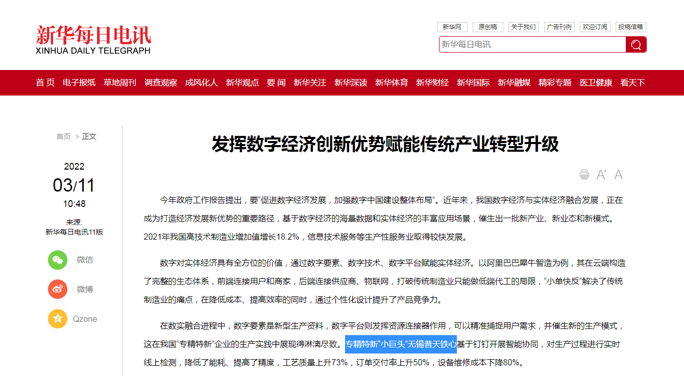 在數(shù)實融合進程中,數(shù)字要素是新型生產(chǎn)資料,數(shù)字平臺則發(fā)揮資源連接器作用,可以精準捕捉用戶需求,并催生新的生產(chǎn)模式,這在我國“專精特新”企業(yè)的生產(chǎn)實踐中展現(xiàn)得淋漓盡致。專精特新“小巨頭”無錫普天鐵心基于釘釘開展智能協(xié)同,對生產(chǎn)過程進行實時線上檢測,降低了能耗、提高了精度,工藝質(zhì)量上升73%,訂單交付率上升50%,設(shè)備維修成本下降80%。